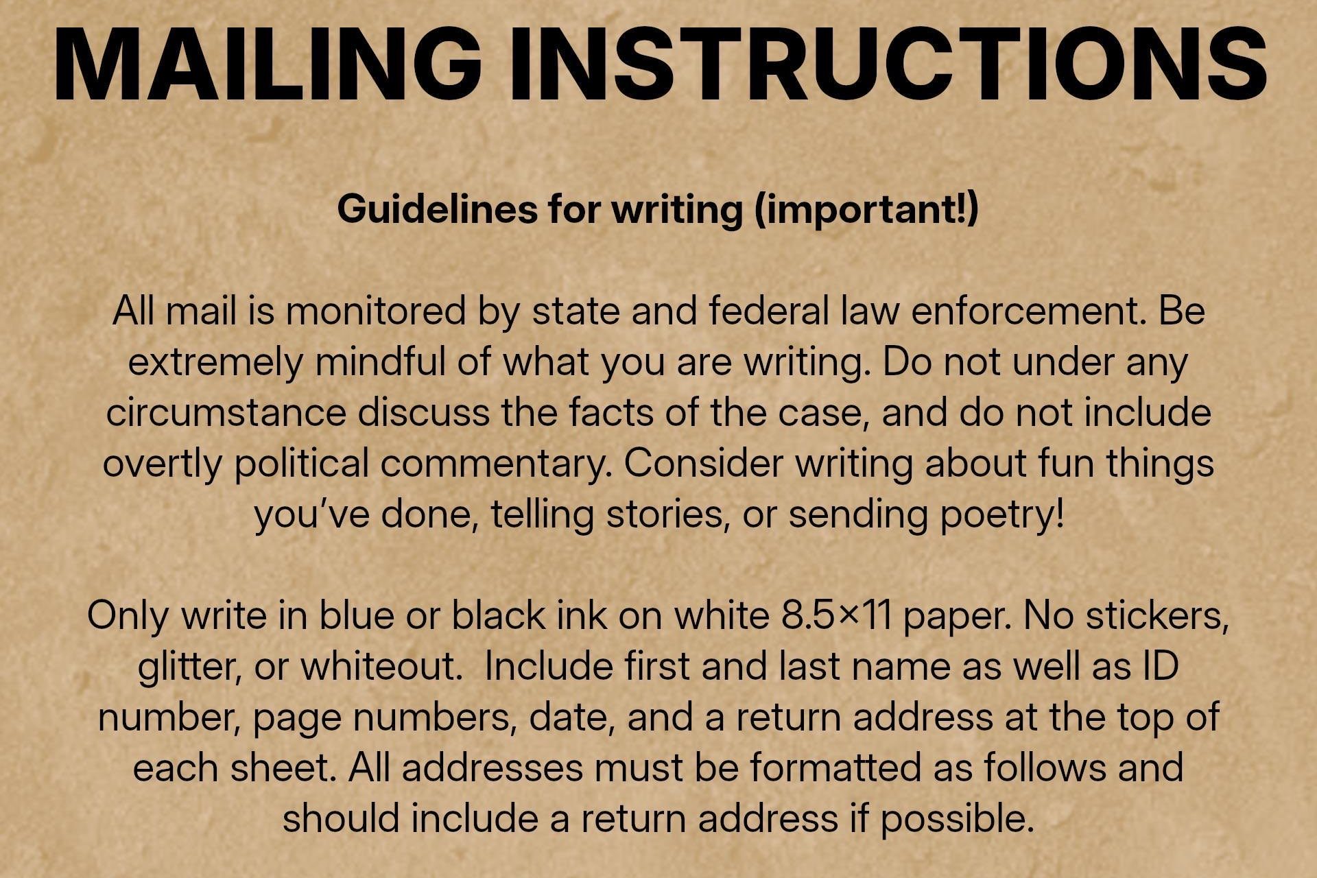 All mail is monitored by state and federal law enforcement. Be extremely mindful of what you write. Do not under and circumstances discuss the case and do not include overtly political commentary. More info below.